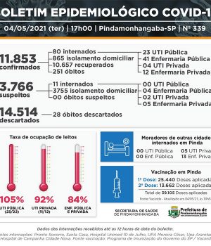 O boletim da Vigilância Epidemiológica de Pindamonhangaba confirmou, nesta terça-feira (04), 3 óbitos confirmados (Alto do Tabaú, Araretama e Padre Rodolfo). O boletim da VE registra ainda 137 novos casos e 67 recuperados. No total, 11.853 moradores de Pindamonhangaba testaram positivo para covid-19.