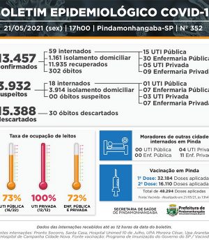 O boletim da Vigilância Epidemiológica de Pindamonhangaba confirmou, nesta sexta-feira (21), 4 óbitos confirmados (Bela Vista, Parque São Domingos, Pasin e Santana). O boletim registra ainda 120 novos casos e 98 recuperados. No total, 13.457 moradores de Pindamonhangaba testaram positivo para covid-19.
