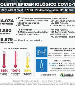 O boletim da Vigilância Epidemiológica de Pindamonhangaba confirmou, nesta sexta-feira (28), 1 óbito confirmado (Alto do Tabaú). O boletim registra ainda 80 novos casos e 103 recuperados. No total, 14.034 moradores de Pindamonhangaba testaram positivo para covid-19.