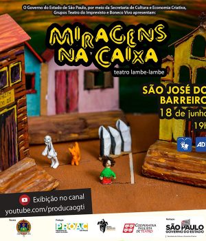 O projeto “Miragens na Caixa” foi lançado em setembro do ano passado, em formato online, por conta da pandemia de covid-19. Além das apresentações, que contemplaram diferentes cidades nas regiões do Vale do Paraíba, Vale Histórico e Serra da Mantiqueira, foi realizada uma oficina de teatro lambe-lambe, com Gustavo Guimarães, do grupo Ciclistas Bonequeiros. Essa atividade resultou na produção de oito mini-espetáculos pelos alunos, que participarão de um bate-papo online sobre o processo criativo logo após a mostra, neste sábado, a partir das 19h, também pelo canal do GTI no Youtube.