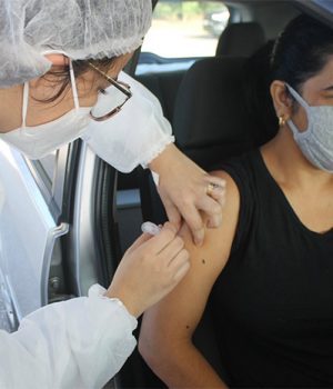Todas as pessoas que estão recebendo a vacina podem colaborar com a campanha Alimento Solidário, levando 1 kg de alimento não-perecível para o Fundo Social de Solidariedade ajudar as famílias que mais precisam.