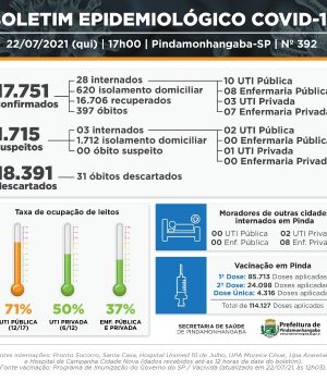 O boletim da Vigilância Epidemiológica de Pindamonhangaba divulgou, nesta quinta-feira (22), 1 óbito confirmado (Mantiqueira). O boletim da VE registra ainda 81 novos casos e 55 recuperados. No total, 17.751 moradores de Pindamonhangaba testaram positivo para covid-19.