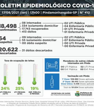 O boletim da Vigilância Epidemiológica de Pindamonhangaba divulgou, nesta terça-feira (17), 51 novos casos, 39 recuperados e nenhum óbito. No total, 18.498 moradores de Pindamonhangaba testaram positivo para covid-19.