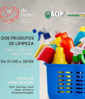 Até o dia 30 de setembro a Associação Comercial e Industrial de Pindamonhangaba – ACIP está arrecadando produtos de limpeza que serão doados ao Lar São Judas Tadeu. A Campanha faz parte do Projeto ACIP do Bem, que ao longo do ano pretende realizar diversas campanhas em prol das Instituições beneficentes da cidade.