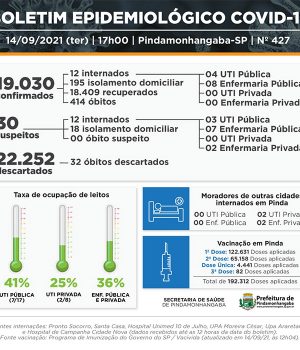 O boletim da Vigilância Epidemiológica de Pindamonhangaba divulgou, nesta terça-feira (14), 73 novos casos, 14 recuperados e nenhum óbito. No total, 19.030 moradores de Pindamonhangaba testaram positivo para covid-19.