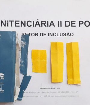 A ocorrência foi registrada no momento da revista dos itens enviados por familiares de presos. Em uma correspondência, agentes encontraram o entorpecente escondido no interior de uma bíblia (entre a capa e as páginas do livro). A remessa foi postada pela companheira de um detento.
