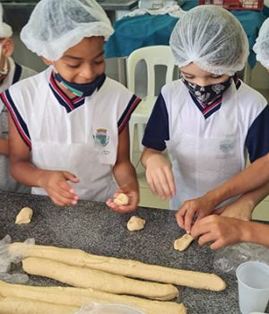 Com o intuito de desenvolver a linguagem materna e a matemática e outros valores como respeito, amizade e inclusão, as turmas do 2º ano C e Pré II B da EM Julieta Reale Vieira envolveram seus alunos num projeto muito especial. Com o auxílio dos professores de panificação, os estudantes desde tenra idade colocaram verdadeiramente a mão na massa.