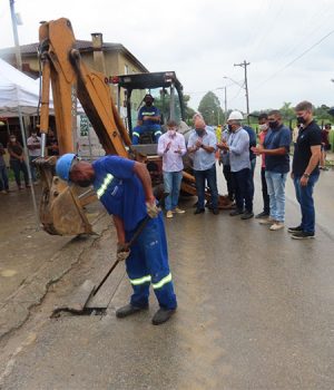 Após as falas das autoridades, uma retroescavadeira iniciou o corte no asfalto no local por onde vão passar os tubos de água.