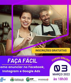 A Secretaria de Desenvolvimento Econômico da Prefeitura de Pindamonhangaba, em parceria com o Sebrae, promove o curso online Faça Fácil. A capacitação é totalmente gratuita e irá ensinar como anunciar no Facebook, Instagram e Google Ads. A aula será no dia 3 de março, às 18h30, de forma online.