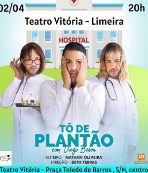 No próximo sábado (02), a partir das 20h, o Teatro Vitória, na cidade de Limeira, interior do Estado de São Paulo, recebe a peça “Tô de Plantão”. O show humorístico de uma hora de duração, criado a partir das diversas personagens elaboradas pelo ator Diego Besou, onde em vários segmentos da saúde são retratadas situações engraçadas de uma forma jamais vista. A risada é garantida com situações cômicas que acontecem entre pacientes e profissionais da área da saúde.