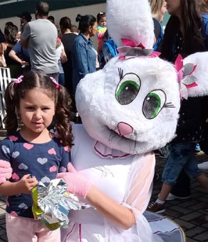 A criança da foto é a Milena de 4 anos, ela estava ansiosa para esse encontro tão inesquecível com o coelhinho da Páscoa.