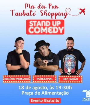 As apresentações com humoristas, no formato ‘stand up comedy’, já conquistaram o público e o Taubaté Shopping vai receber dois espetáculos com humoristas que sempre garantem muita diversão ao público. Nesta quinta-feira (18), às 19h30, será a vez de Luiz Paixão, Marcio Pial e Rogerio Morgado comandarem a apresentação.
