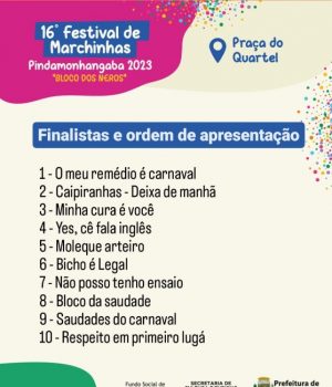 A Prefeitura de Pindamonhangaba, por meio da Secretaria de Cultura e Turismo, anunciou os finalistas do 16°Festival de Marchinhas 2023 “Bloco Os Neros”. Foram realizadas duas eliminatórias, na sexta-feira (10) e sábado (11).