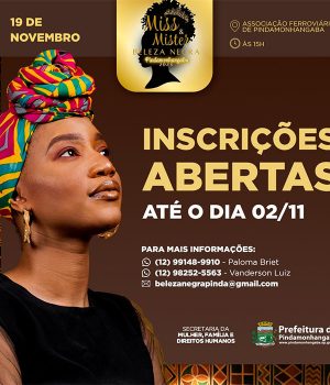 As inscrições para o Concurso Miss e Mister Beleza Negra Pindamonhangaba 2023, promovido pela Prefeitura de Pindamonhangaba, por meio da Secretaria da Mulher, Família e Direitos Humanos, com o apoio da Secretaria de Cultura e Turismo, encerrarão no dia 2 de novembro.