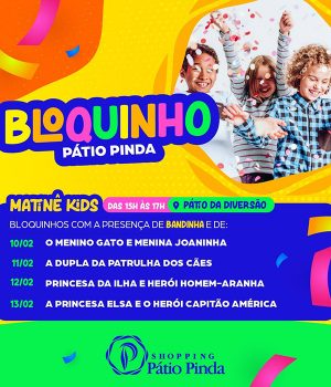 No espaço Pátio da Diversão, próximo à loja Riachuelo, acontecem as matinês infantis com a participação de personagens, sempre das 15h às 17h. Já na Praça de Alimentação, das 17h às 20h, o público também poderá conferir as apresentações musicais da ‘Folia no Pátio Pinda’, com o CarnaPower e o CarnAxé 90. Todas as ações são gratuitas.