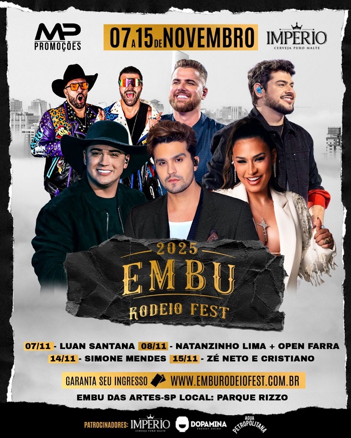 De 07 a 15 de novembro, o Parque Rizzo, em Embu das Artes, será palco de uma das maiores festas da região metropolitana de São Paulo: o Embu Rodeio Fest 2025. Com uma programação intensa de montarias em touros e cavalos, o evento promete reunir milhares de pessoas em uma celebração de música, tradição e solidariedade.